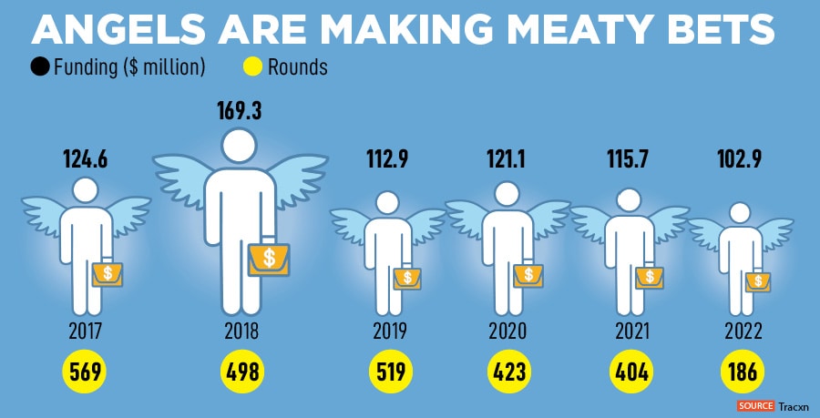 Back in Gurugram, Das and Narang explain the full story. In terms of numbers, angel funding has remained steady at over $100-million. While there was a slight dip from $115.7 million in 2021 to $102.9 million in 2022, the duo explains that this is actually a positive sign. The $102.9 million funding came in 186 rounds as against $115.7 million in 404 rounds, according to data shared by Tracxn.