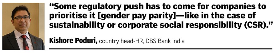 Pay gap has been one of the major challenges faced by women in the workforce, and this gap only widens as women advance in their careers, says Kishore Poduri, country head-HR, DBS Bank India.