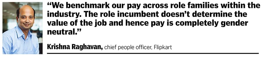 One of the best ways to enable equity is to ensure the pay is determined by the value of the job and not linked to a certain individual, says Krishna Raghavan, chief people officer, Flipkart. “We benchmark our pay across role families within the industry. The role incumbent doesn’t determine the value of the job and hence pay is completely gender neutral," he says. “I believe that the best way to enable gender equality is to ensure gender neutrality in everything we do." Women, he adds, do not like extra privileges that undermine their merit, so “our job is to create an equitable environment to enable a diverse workforce to thrive".