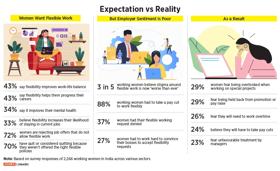 Care work has also been undermined, she says, and it is time companies recognise it, and start advocacy and conversations around it. As per the latest time-use survey on women’s and men’s work released by the National Sample Survey Office (NSSO) in 2020, every day, women in the labour force spend 237 minutes (or four hours) doing unpaid work for household members, compared to 93 minutes (or 1.5 hours) spent by men. This indicates that men perform domestic work when they are relatively free from paid work, but that is not a choice for most women. This disproportionate burden of unpaid care work often results in women dropping out of the workforce entirely. “Care work is hard work, and essential work," says Menon. Organisations, she says, must have policies where they “look at productivity more than facetime".