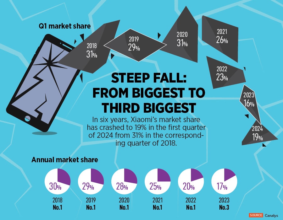 From a record 31 percent volume market share in the first quarter of 2018, Xiaomi slipped to 16 percent in the corresponding quarter of 2023. A year later, it inched to 19 percent. The annual report card too reflected the grim reality. From a 30 percent market share in 2018, Xiaomi tumbled to 17 percent in 2023. A player that occupied the top slot for 20 consecutive quarters, made way for Samsung in the third quarter of 2022.