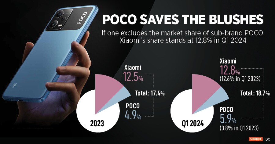 Xiaomi, say market experts and analysts, fell victim to its obsession with online-heavy strategy. "Too many variants, too many models, an aggressive flanking strategy, and a fledgling offline plan added to its woes," believes Faisal Kawoosa, founder of techARC, a technology analytics, research, and consulting firm. If one excludes the market share of sub-brand POCO, Xiaomi"s share stands at 12.8 percent in Q1 2024. “POCO has salvaged the situation," he underlines.