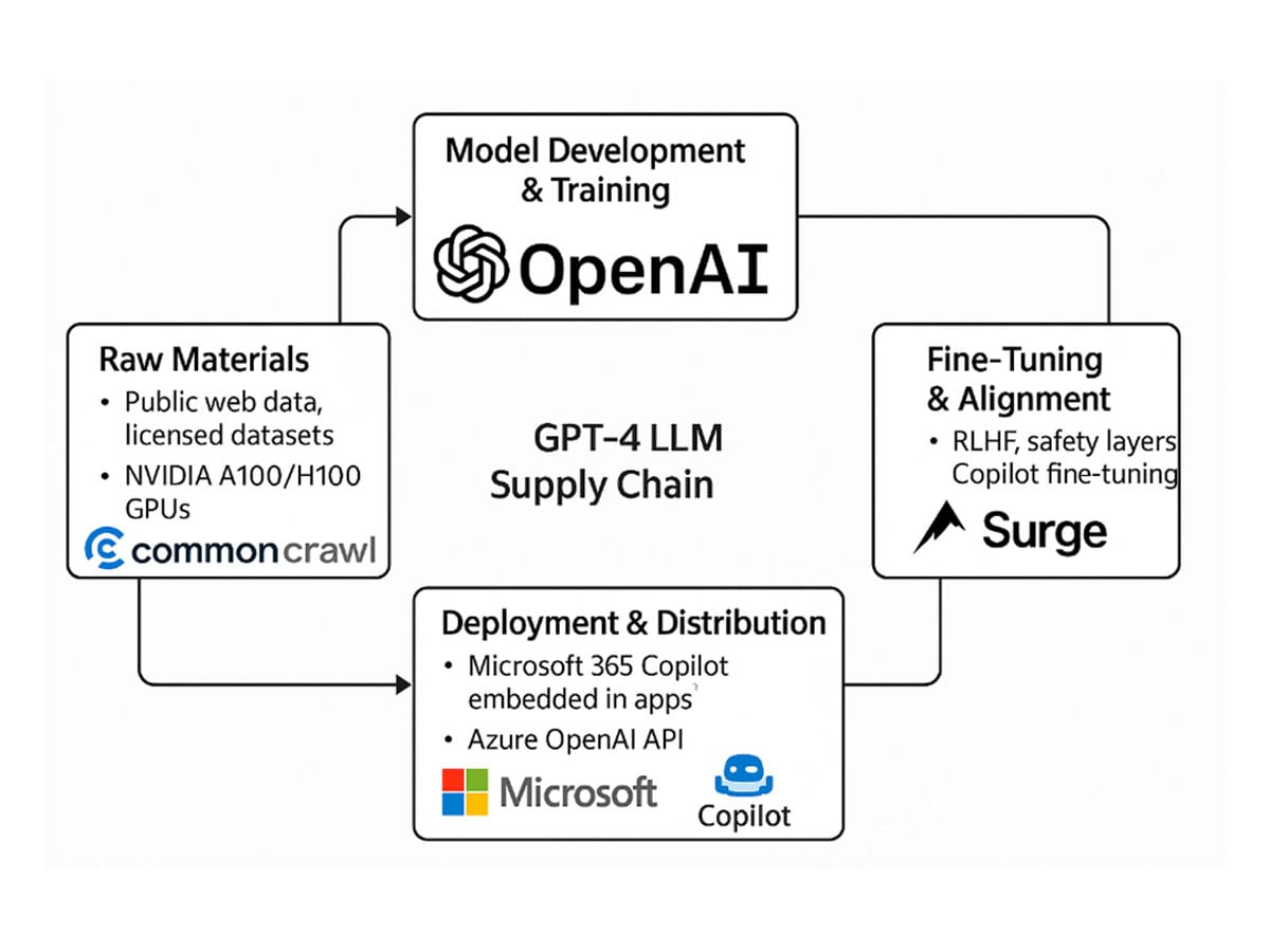 Microsoft Copilot (MC) is a very popular commercial application of an LLM supply chain model. Microsoft Copilot has a three-tiered LLM supply chain structure, which includes public web data; licensed datasets; and corporate data. All of these resources support the day-to-day operations of MC. This supply chain model uses large (NVIDIA) GPU clusters and Azure supercomputing centers as its base infrastructure. The MC supply chain model’s (SCM) model lifecycle structure sits on top of this base infrastructure. This SCM model lifecycle structure includes the GPT-4 architecture from OpenAI and (reinforced) learning models that have been trained using large amounts of data and information. These learning models are then fine-tuned for Copilot specific LLM output to work within Microsoft applications (Word and Excel). Finally, the Microsoft Copilot SCM’s deployment and distribution ecosystem resides in the Model Lifecycle Layer. It is deployed via Microsoft 365 Copilot and integrated into every Microsoft application. It also adheres to enterprise level data governance rules, and HIPAA/GDPR compliance regulations.