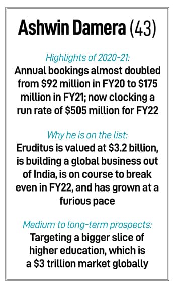 Ask the first-generation entrepreneur about his edtech empire Eruditus, which is valued at $3.2 billion and primed to soar to greater heights, and the chartered accountant quickly dishes out a stratospheric number: $3 trillion. “That’s the market size of higher education globally," asserts the co-founder of Eruditus, which along with its online division Emeritus, offers business and professional education to executives by collaborating with top-tier universities across the US, Europe, Latin America, India and China. “There are 20,000 universities in the world," says Damera, who co-founded Eruditus with Chaitanya Kalipatnapu in 2010. “You can’t just play in India or the US," he underlines. One must, he lets on, play in the entire pond, and not just in a small little part of it.