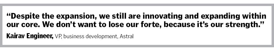 Over the years, Astral has expanded from pipes to adhesives, water tanks and soon, sanitaryware and faucets. “Despite the expansion, we are still innovating and expanding within our core. We don’t want to lose our forte, because it’s our strength," adds Kairav.