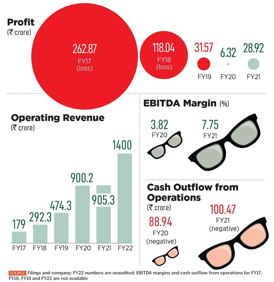 In December 2019, Lenskart entered the unicorn club when it reportedly raised around $231 million in a Series G funding round led by Japanese financial conglomerate SoftBank. In FY20, over a decade after starting the venture, Bansal posted the firm’s maiden profit. The next fiscal, the unicorn remained profitable, and the trend continued in FY22 as well. “We are profitable. Now the business is at 69 percent gross margin, and we never achieved this number by increasing the price," claims Bansal. Though he declines to share profit data for FY22, he contends that the company posted an operating revenue of ₹1,400 crore, a healthy jump from ₹905.3 crore in FY21. “Our current Ebitda run rate is ₹20 crore a month," he claims.