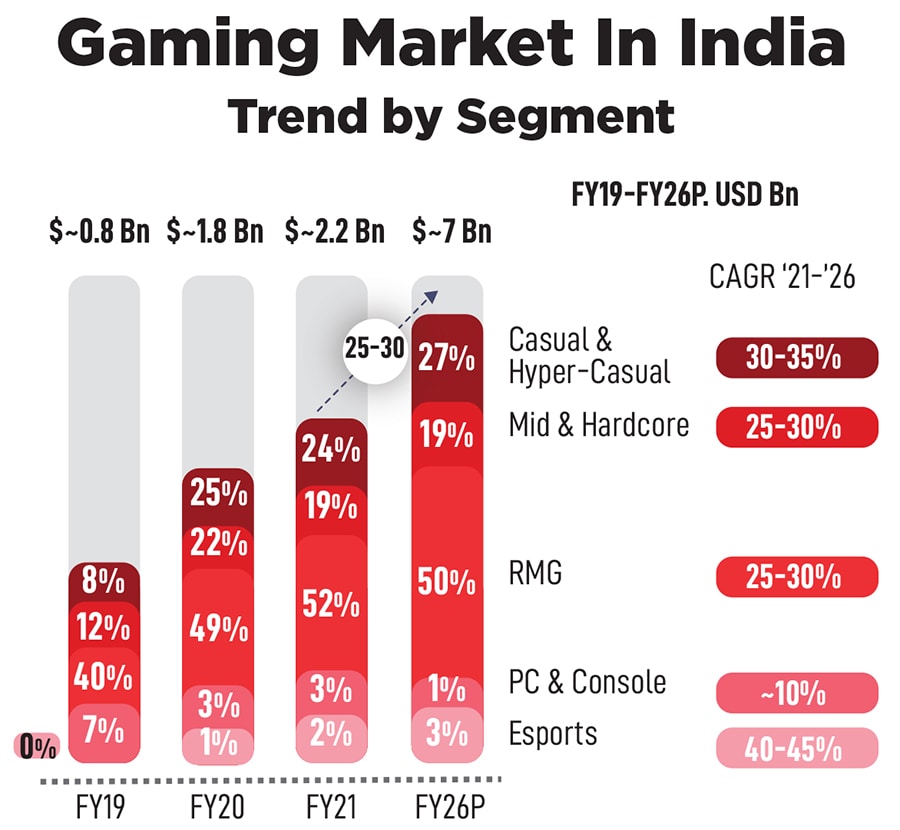 The gaming industry in India was estimated at $2.2 billion in 2021 and is expected to hit $7 billion by 2026—more than 3x in the next 5 years, says Lumikai, a gaming-focused VC fund. According to Inc42, at present, the industry has three gaming unicorns—Dream Sports, Games24x7 and MPL.