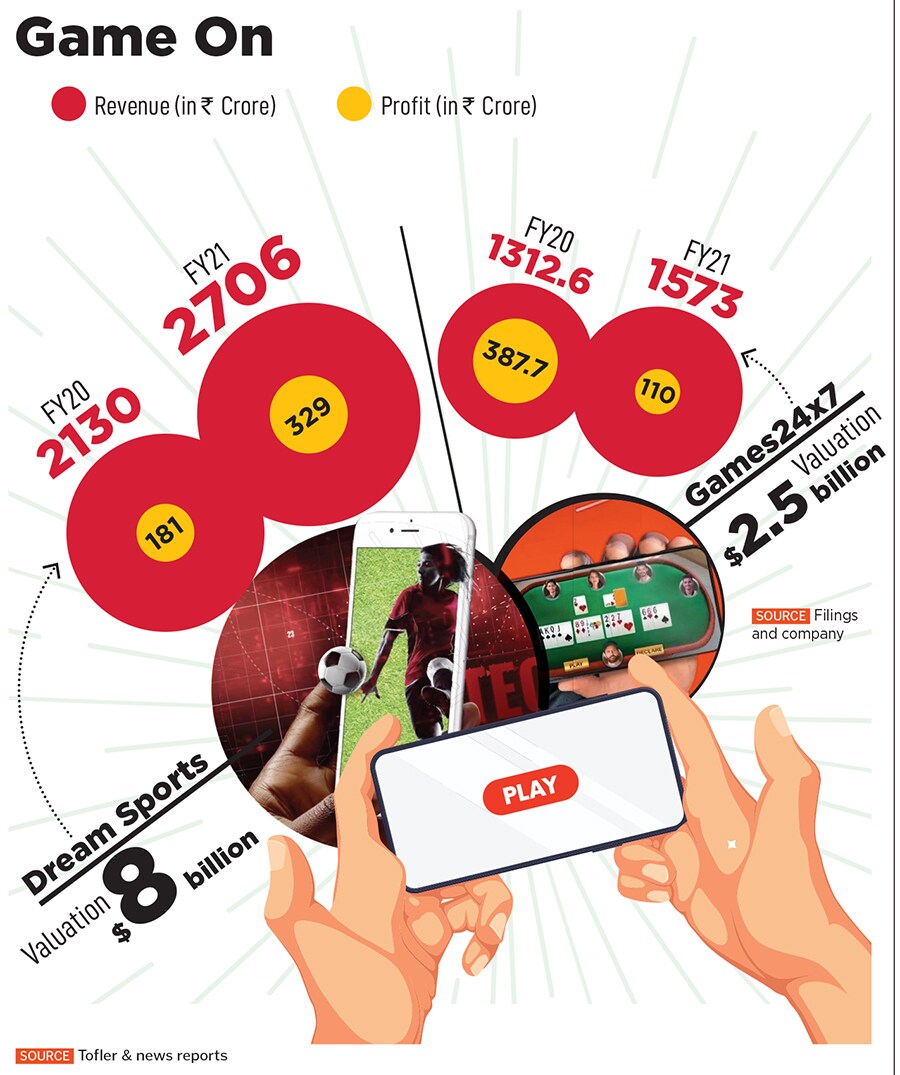 On the other hand, Games 24x7 has been betting big time on RummyCircle—the largest contributor to its total revenue—followed by My11Circle, a fantasy gaming platform. Outside of these, Games24x7 also launched Ultimate Teen Patti and U Games, a casual gaming studio. The company has seen close to 100 million users across platforms, and for FY21, it posted a revenue of ₹1,573 crore and profit of ₹110 crore.