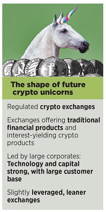 Sogani says if crypto regulations are not implemented and users do not find confidence in trading on these platforms, trading volumes will suffer and revenue generation will continue to be difficult. “While the smaller exchanges are likely to shutter, the larger ones will find the going difficult. The future of the two crypto unicorns is shaky they will need to rework their business models to survive," he says.