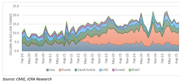 India is the third largest consumer of crude oil after the United States and China. India’s crude oil consumption has increased from 183.9 million metric tonne (MMT) in FY2015 to 265.7 MMT in FY2025, growing at a CAGR of 3.7 percent, while the domestic production of crude oil has declined from 37.5 MMT to 28.7 MMT during the same period. Currently, only 12 percent of the country’s need is met domestically, while 89 percent is met through imports, entailing a huge import bill. The demand for crude oil is expected to increase by 2-3 percent in FY2026 and will continue to increase over the next several years. However, the growth in domestic crude oil production is expected to be limited, hence the high dependence on imports.