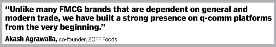 For emerging FMCG brands like ZOFF Foods, quick commerce has become a cornerstone of discovery and conversion. “Unlike many FMCG brands that are still heavily dependent on general trade and modern trade, we have built a strong presence on q-comm platforms from the very beginning,” says Akash Agrawalla, co-founder, ZOFF Foods.
