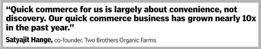 For Two Brothers Organic Farms, quick commerce plays a different role. “Quick commerce for us is largely about convenience, not discovery,” says its co-founder, Satyajit Hange. Most of its consumers first engage with the brand through its D2C platform or social media and then turn to q-comm for faster deliveries.