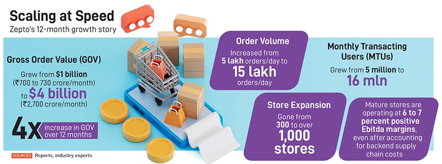“We have gone from $1 billion [annualised GOV] to about $4 billion,” says Palicha. Daily order volumes have surged to 1.5 million and MTUs have grown to 16 million by September. Zepto now operates close to 1,000 dark stores across 70 cities.