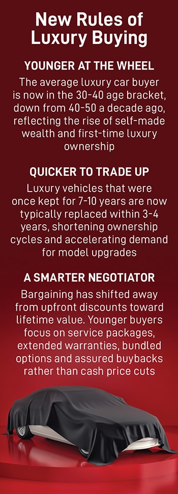Sharad Kachalia, director at Navnit Group, which operates several luxury car dealerships, says the profile of the average buyer has shifted markedly over the past decade. “Ten years ago, the typical luxury buyer was in his late 40s or 50s,” Kachalia says. “Today, most new buyers are in the 30-40 age bracket, sometimes even in their late 20s.”