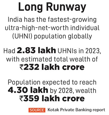 The numbers point to a disconnect. India was home to an estimated 2.83 lakh ultra-high-net-worth individuals (Ultra HNIs) in 2023 with combined wealth of ₹232 lakh crore, according to a Kotak Private Banking report. That figure is projected to surge to 4.3 lakh individuals with wealth of ₹359 lakh crore. Yet annual luxury car sales hover around just 50,000 units.