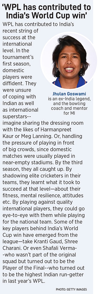 In effect, says Adesara of Adani Sportsline, the World Cup victory has done more for women’s cricket than the 1983 triumph did for the men’s game. “Consumption of women’s cricket had already begun with three seasons of the WPL, so when the World Cup win came, the impact multiplied manifold,” he says. “Safe to say that by the end of WPL Season 4, the consumption and engagement of women’s cricket will have more than doubled from what it was in Season 1.”