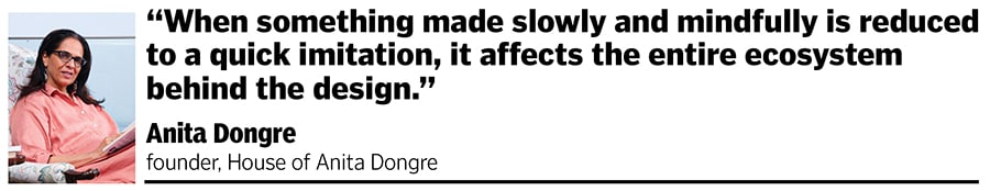 Fashion designer Vaishali Shadangule, who has seen her designs copied blatantly, offers a more philosophical perspective. “When designers replicate our work, it’s almost an unintended acknowledgement that we are building something original and relevant,” says Shadangule whose entire collections and signature cording technique have echoed across markets, even internationally.