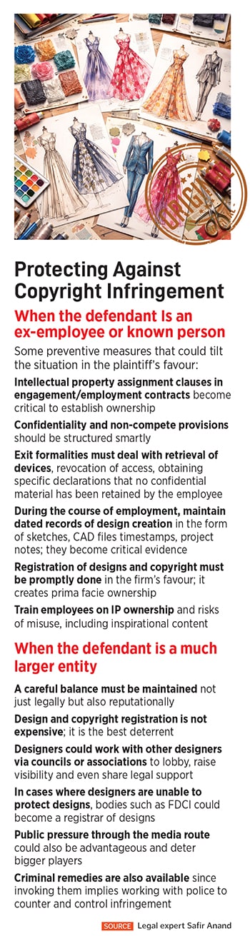 Legal expert Safir Anand, who has handled plagiarism cases for designers such as Malhotra, Sabyasachi, Shantnu and Nikhil, and Dongre, says designers are often able to secure swift legal relief in clear cases of infringement. Interim injunctions are frequently granted on the first date of hearing.