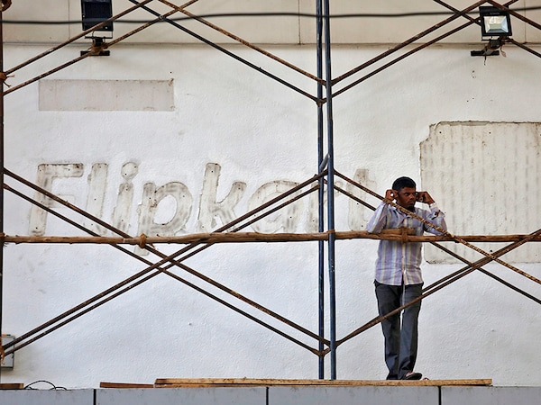 A worker stands in front of a wall with removed Flipkart logo outside the company's former office in Bengaluru, India May 9, 2018 Image: Abhishek N. Chinnappa / Reuters
