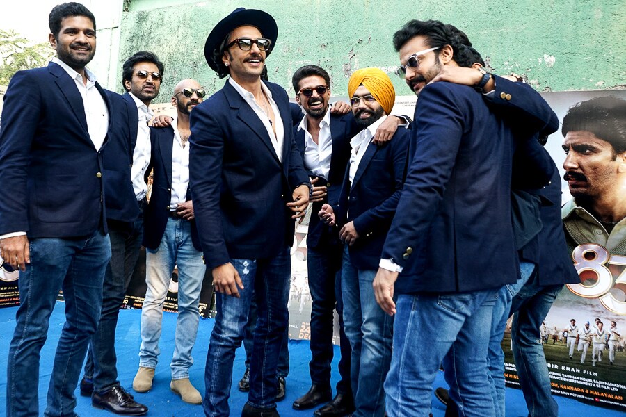 Ranveer Singh and his fellow actors attend the "83" film photocall in Mumbai, India, December 21, 2021. Slated for release on 24th December, the film is based on the true story of India’s iconic 1983 World Cup victory against the West Indies, with Ranveer playing the legendary captain Kapil Dev.