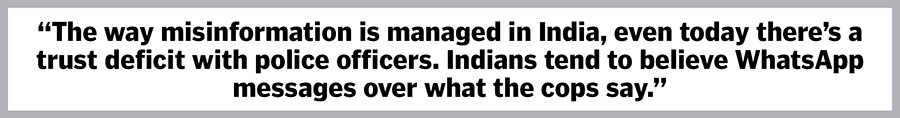 Yet, in 2018, when Rajeshwari, then the district police chief of Telangana’s Jogulamba Gadwal region, received reports of villagers ganging up and attacking strangers “it didn’t occur to me that the malaise that had exploded with the US elections would trickle down to a backward, low-literacy district in Telangana". Gadwal had a history of factional political violence, hence occasional brutalities weren’t unheard of, but her beat officers pointed the finger elsewhere. “They found two WhatsApp videos doing the rounds and spreading rumours of a kidnapping and an organ harvesting gang on the prowl," says Rajeshwari. The digital gossip blew up into a law and order problem.