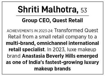 Fast forward to March 2024. Malhotra has had a stunning professional flight. As the group CEO of Quest Retail, a specialty retailer that is an Indian franchisee for The Body Shop, and has brought a sea of other marquee international brands to the country, Malhotra has spearheaded the India journey of brands such as Kiehl’s, Anastasia Beverly Hills, Kylie Cosmetics, Avon, Max Factor, Boddess, Juice Beauty, Neal’s Yard Remedies, Ecotools, Freeman and The Honest Tree.