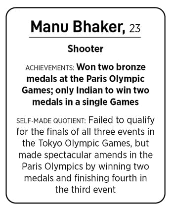 “Manu has always been very confident at the shooting range. Her belief in herself helped her bounce back and start from zero after the Tokyo Olympics," says father Ram Kishan Bhaker. “She was also inspired by I am Bolt [the 2016 biopic on Jamaican runner Usain Bolt]."