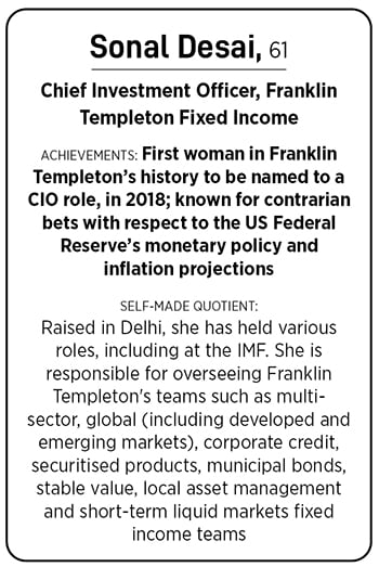 The numbers don’t lie. In Sonal Desai’s case, they tell a story of how she played a significant role in managing global macro strategies at Franklin Templeton fixed income, which exceeded $200 billion in total assets under management during her tenure. Known for her contrarian bets, Desai, chief investment officer (CIO), Franklin Templeton fixed income, oversees Franklin Templeton’s teams (see box). She is also a portfolio manager for a diverse range of strategies, including core plus, multi-sector and global aggregate fixed income, showcasing her versatility and depth of expertise. “The intellectual breadth of the job forces you to think about policy, geopolitics, macroeconomics, financial markets, and somehow bring it all together," says Desai, who joined Franklin Templeton as director of research for global macro strategies in 2009. A year later, she became co-portfolio manager on global macro strategies. In 2018, she became CIO of the Franklin Templeton fixed income platform, the first woman to hold that position in the group.