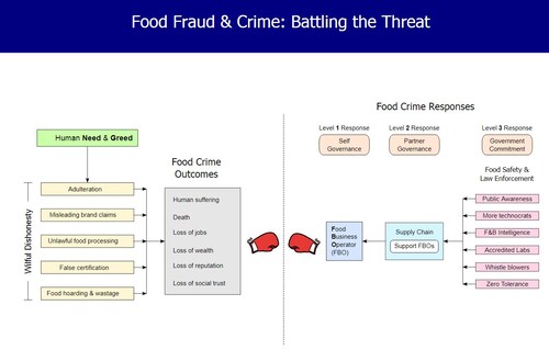 Let’s start with a story that a colleague shared with me…“Imagine a group of children eating their midday meals, lucky enough to get nourishment from milk, which otherwise they would not be able to afford. Here’s how milk may sometimes be ‘made’ for them, or for the general public. .. "From full-fat buffalo milk, remove the milk fat, which has a good market by itself. Replace it with some vegetable oil and water, emulsifying the two with detergent – which gives it that nice frothy look. Add ammonium sulphate to increase the density, and melamine to increase the protein content. Next, add some urea to give it the body and colour it needs. (Don’t worry—I’m assured urea is a natural constituent of milk). Now add some caustic soda, and a little sugar to adjust for taste. There’s more we can do to make it even more affordable, but it’s a family recipe and this is all I can share. The ill-gotten gains from such fraudsters are usually enough to pay the authorities (including people in my own department) and circumvent the law. Inevitably, they get away. ”It was depressing to hear how far people go for profiteering, but I felt grateful to the food safety officer who was sharing this frustration with me. Over the years, I learnt that besides adulteration, there are also misleading claims on labels, untrue brand narratives, unlawful food processing (unapproved premises / unauthorised techniques), fudged food certification, unchecked food hoarding and wastage. Wilful dishonesty in food production or supply that may be detrimental to consumers or overall public interest isn’t just food fraud. .. it’s a crime!Ironically, our recollection of food scams and human suffering, including death that goes with them, is very short lived; as the memory dies, so does the culpability of the perpetrators. Food crime erodes consumer trust and confidence in the system, the sector, and the nation at large. It eventually leads to loss of wealth for the business, the industry and the exchequer, and inevitably, to loss of jobs and reputation as well. If we agree that this is too heavy a price to pay, we must take a united stance to fight food crime. The key to preventing or diminishing food crime, as with any other crime, is to mitigate the means, the motivation, or the opportunity to commit it. Basically, make it unthinkable or unattractive for Food Business Operators (FBOs) to cheat, at any stage in its supply chain. Difficult? Yes. But worth it. Worldwide, there are two factors that override the moral compass of the FBO and drive him or her to food crime—the need for business survival (reducing business margins from intense competition), and the greed for increasing profitability. When legit FBOs face unfair competition from operators who use fraud to increase their margins, they’re forced to either quit or otherwise “play the game”. If they choose the latter, they inevitably transition from mere negligence in food safety to outright dishonesty. Changing expiry dates to cut impending losses from products expiring shortly, is an example. Getting away with fraud like this emboldens operators to indulge in further unfair practices, until a point that they simply do not know where to draw the line anymore. Sad, considering the unofficial oath of an FBO is to never feed his customer something he wouldn’t eat himself. So the first level of responsibility lies with the individual FBO himself; the next level with other FBOs within his supply chain; and the final level (when the first two fail), with food safety and law enforcement agencies administered by the government.
