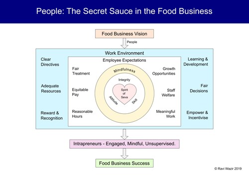 It was my first on-the-job stint at a five star while studying hotel management, and I was about to get my first lesson on why the food business is called the people business. The tick-tock of her heels through the hotel corridors had everyone in the banquet department suddenly standing more upright, appearing more purposeful and generally scurrying around to put things in place as they were meant to be. After her inspection. .. some corrected, some chided and on rare occasions even complimented; the sound of her heels faded away and a distinct sigh of relief heard from the team. Since then, through my career, I’ve studied people productivity both supervised and unsupervised with a singular purpose: To understand the impact that mindful presence has on converting business vision to reality, day after day. It’s tough enough nowadays to attract and retain good talent in the sector. One must also evaluate “affordability” of people in relation to their performance. A financially affordable person performing poorly is actually quite unaffordable; while an “expensive” one who performs well, is inevitably affordable. Over time, I’ve realised that to execute business vision, since I can’t be present 24x7, my own measure for success in the people department must be how well teams perform in my absence and in the absence of their other leaders, i. e. unsupervised. While hiring, I look at 3 things – integrity, attitude and skill, in that order; because I can teach skill completely, attitude partially, but integrity. .. not at all. I find that after screening through these three filters, giving employees what they expect and creating a good work environment usually leads to more engaged employees, thus more unsupervised productivity and mindful presence. What the employee expects