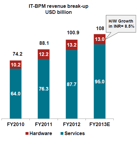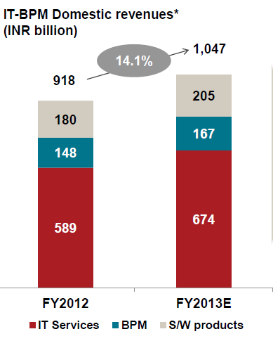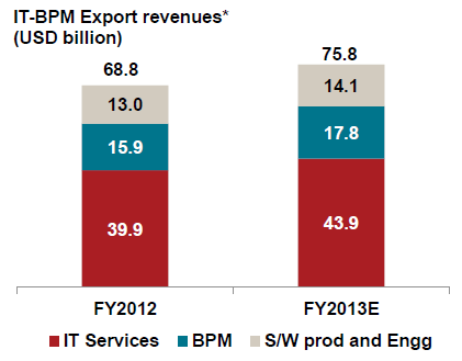 That market continues to drive ecommerce even today. Economic Times reports that for many e-commerce firms get half their revenues from small towns. For Myntra it's 55%, for Jabong, it's 50% and for Indiatimes' it's 40%. If the number surprises you, it should surprise you for being too small. The total population of the top 6 metroes (even if you consider national capital region as a metro) is 65 million, not even a percentage of India's population. The bigger market lies really outside. And the bottleneck there is infrastructure. As that gets better, expect the contribution from smaller towns to grow. IT/BPO in 2013Nasscom said India's IT-BPO exports is likely to grow 14% in the next fiscal year. Here are some interesting graphs from a presentation it made today in Mumbai